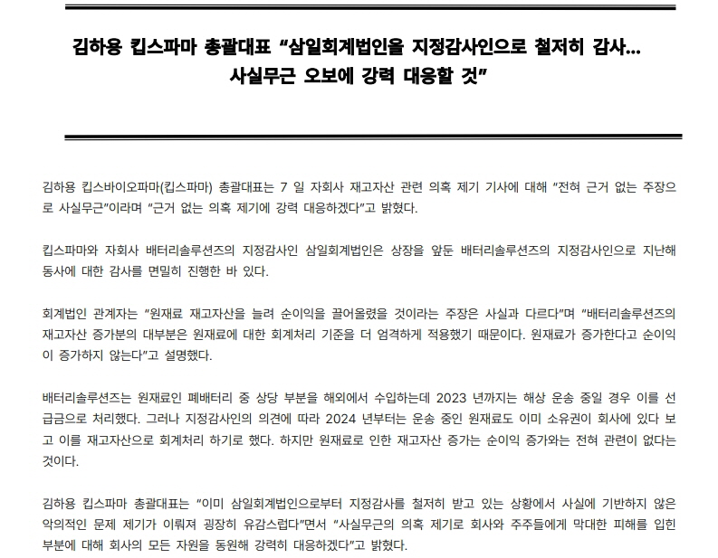김하용 킵스파마 총괄대표 "삼일회계법인을 지정감사인으로 철저히 감사... 사실무근 오보에 강력 대응할 것"