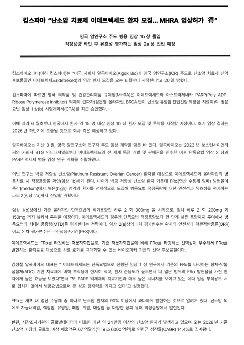 난소암 치료제 이데트렉세드 환자 모집… MHRA 임상허가 得